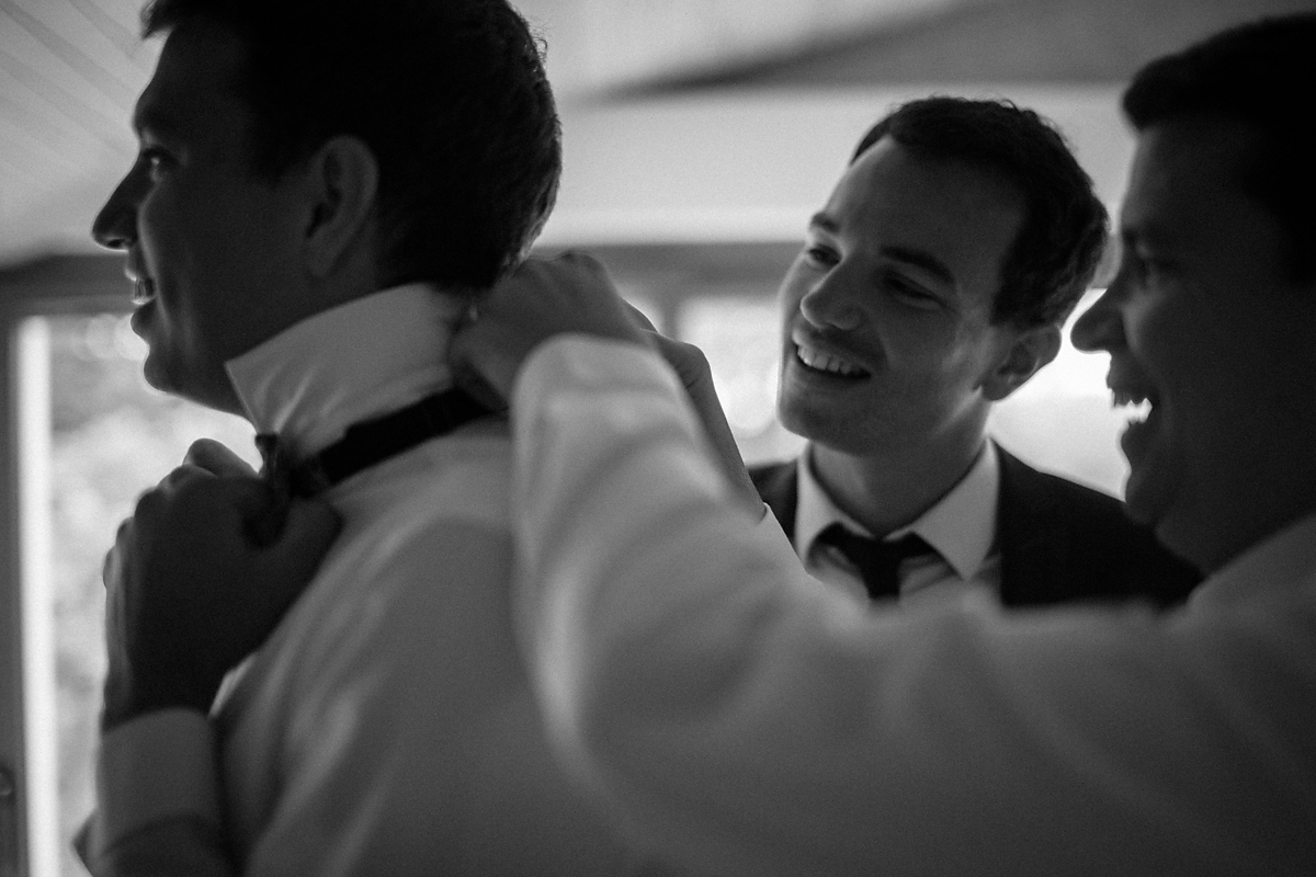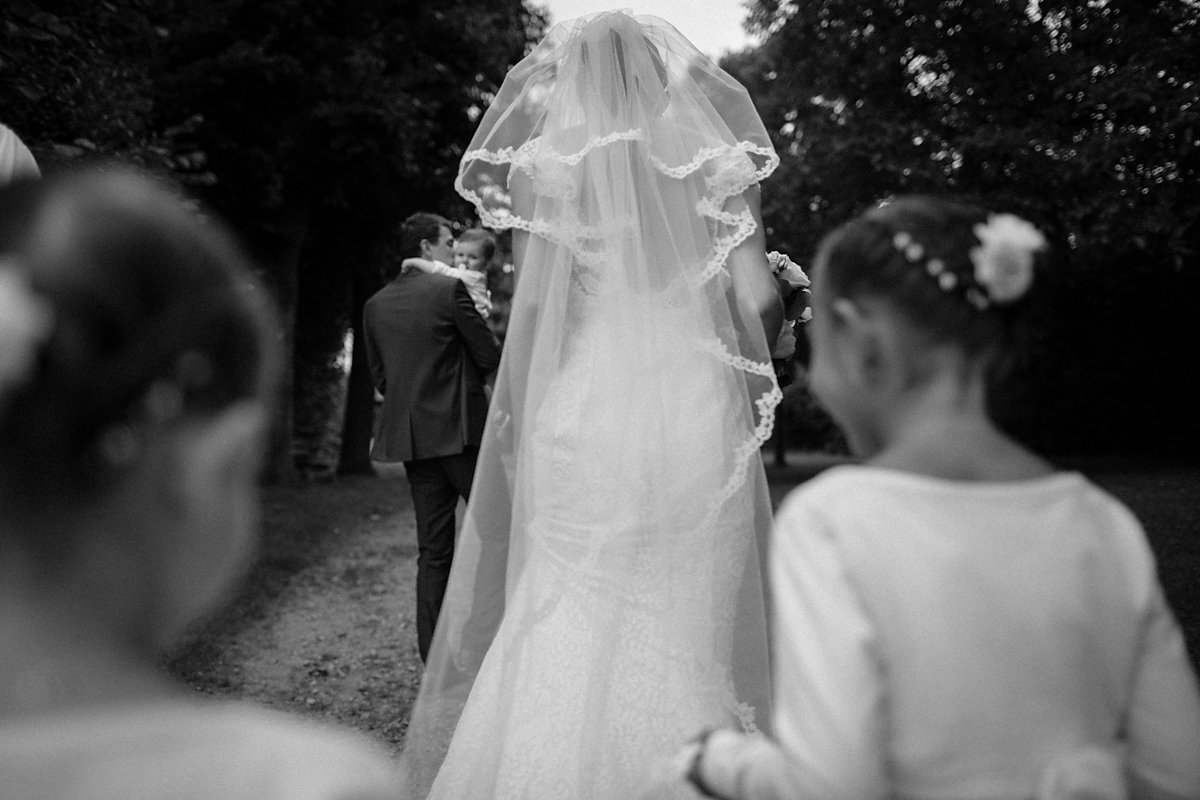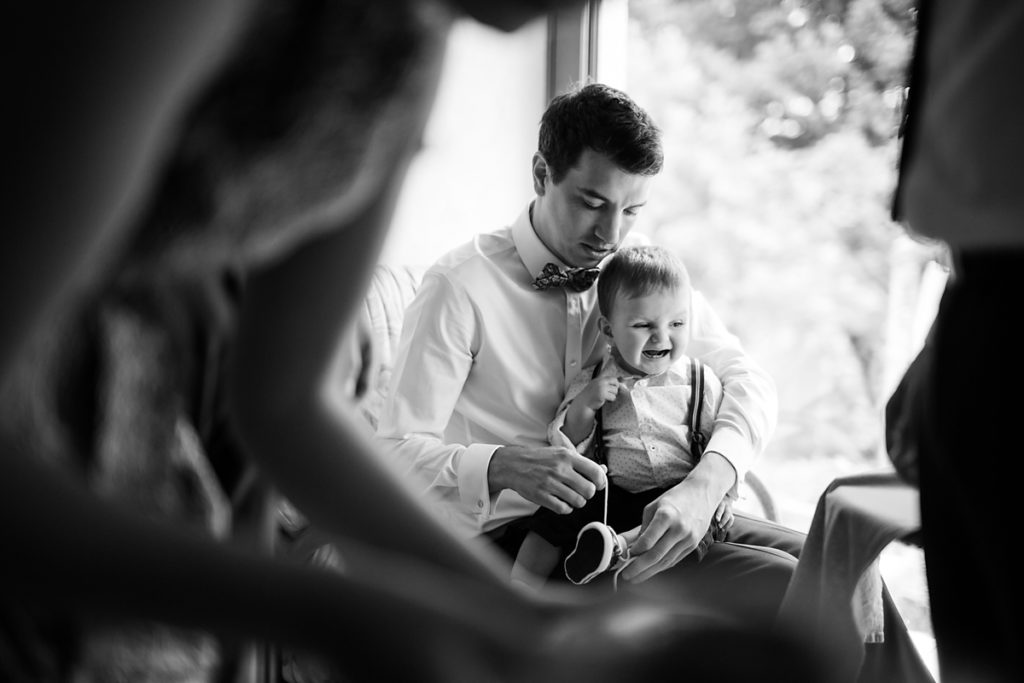Un + pour de sympathiques moments capter comme la grimace du petit garçon en train d’être habillé et le regard du marié qui, comme souvent, rencontre des difficultés pour passer les alliances.